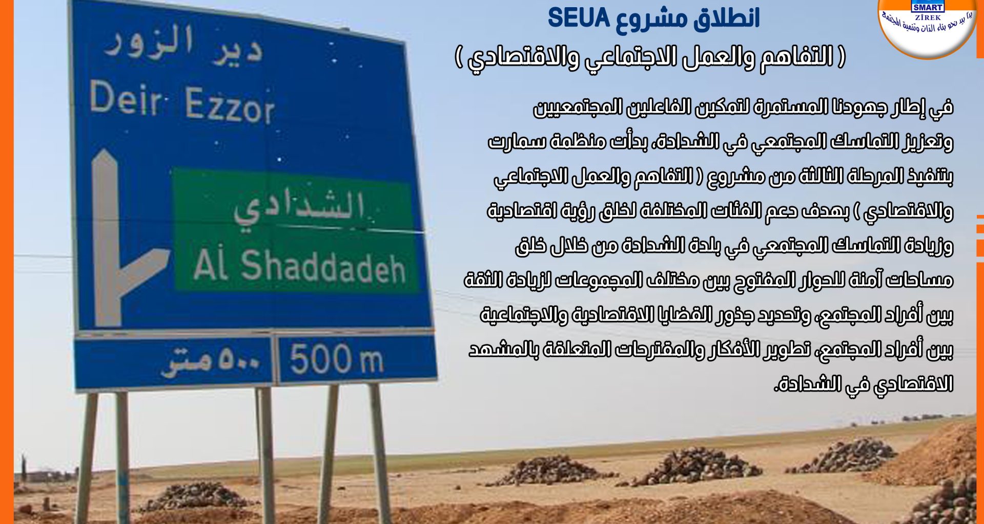 في إطار جهودنا المستمرة لتمكين الفاعلين المجتمعيين وتعزيز التماسك المجتمعي في الشدادة، بدأت منظمة سمارت بتنفيذ المرحلة الثالثة من مشروع ( التفاهم والعمل الاجتماعي والاقتصادي ) بهدف دعم الفئات المختلفة لخلق رؤية اقتصادية وزيادة التماسك المجتمعي في بلدة الشدادة من خلال خلق مساحات آمنة للحوار المفتوح بين مختلف المجموعات لزيادة الثقة بين أفراد المجتمع، وتحديد جذور القضايا الاقتصادية والاجتماعية بين أفراد المجتمع، تطوير الأفكار والمقترحات المتعلقة بالمشهد الاقتصادي في الشدادة.